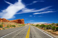 The road into Arches National Park under a classic desert blue sky with high clouds.